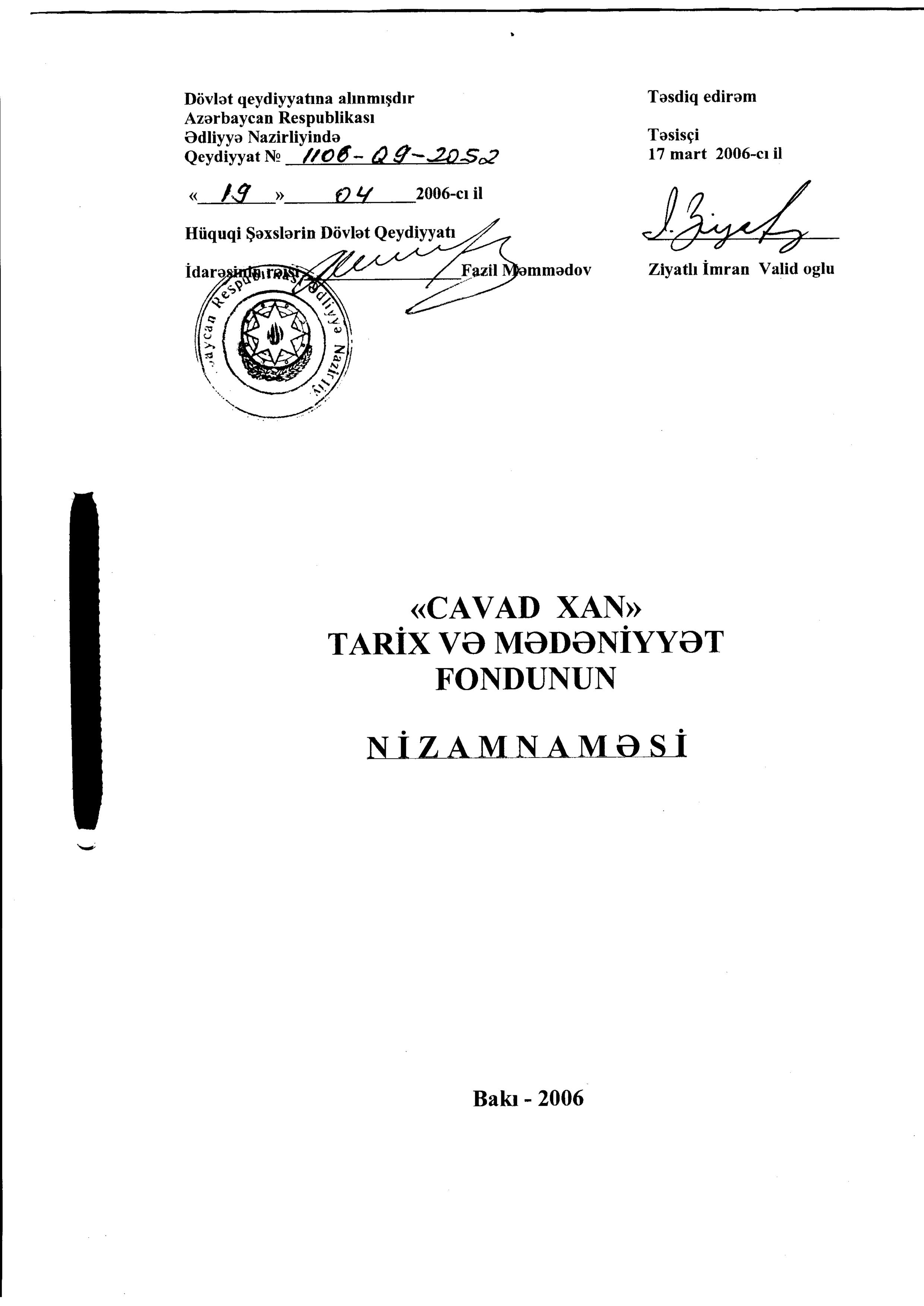"Cavad Xan" Tarix və Mədəniyyət Fondu 17 mart 2006-cı il tarixində Bakı şəhərində təsis edilib və 19 aprel 2006-cı il tarixində Azərbaycan Respublikasının Ədliyyə Nazirliyi tərəfindən qeydiyyata alınmışdır.